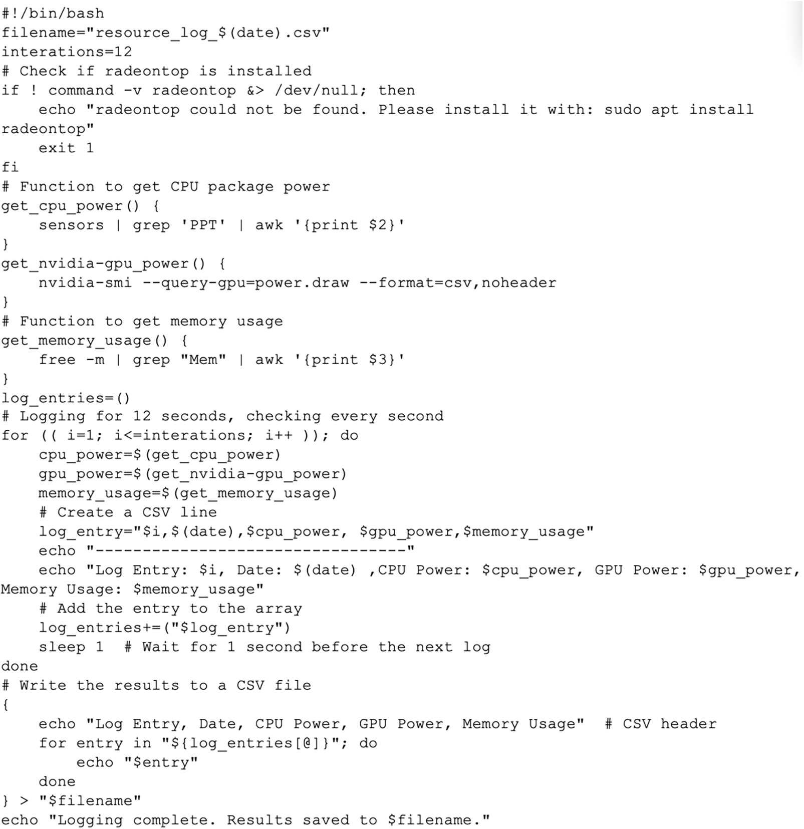 2. Logging Method: The data collection procedure for Ubuntu involved a custom script to log CPU and GPU power consumption along with memory usage. The pseudocode in Fig. 1 details the methodology used for logging the data.