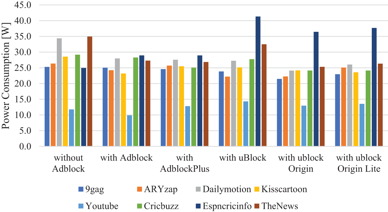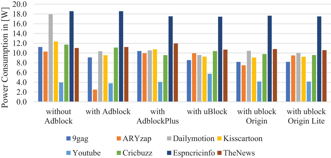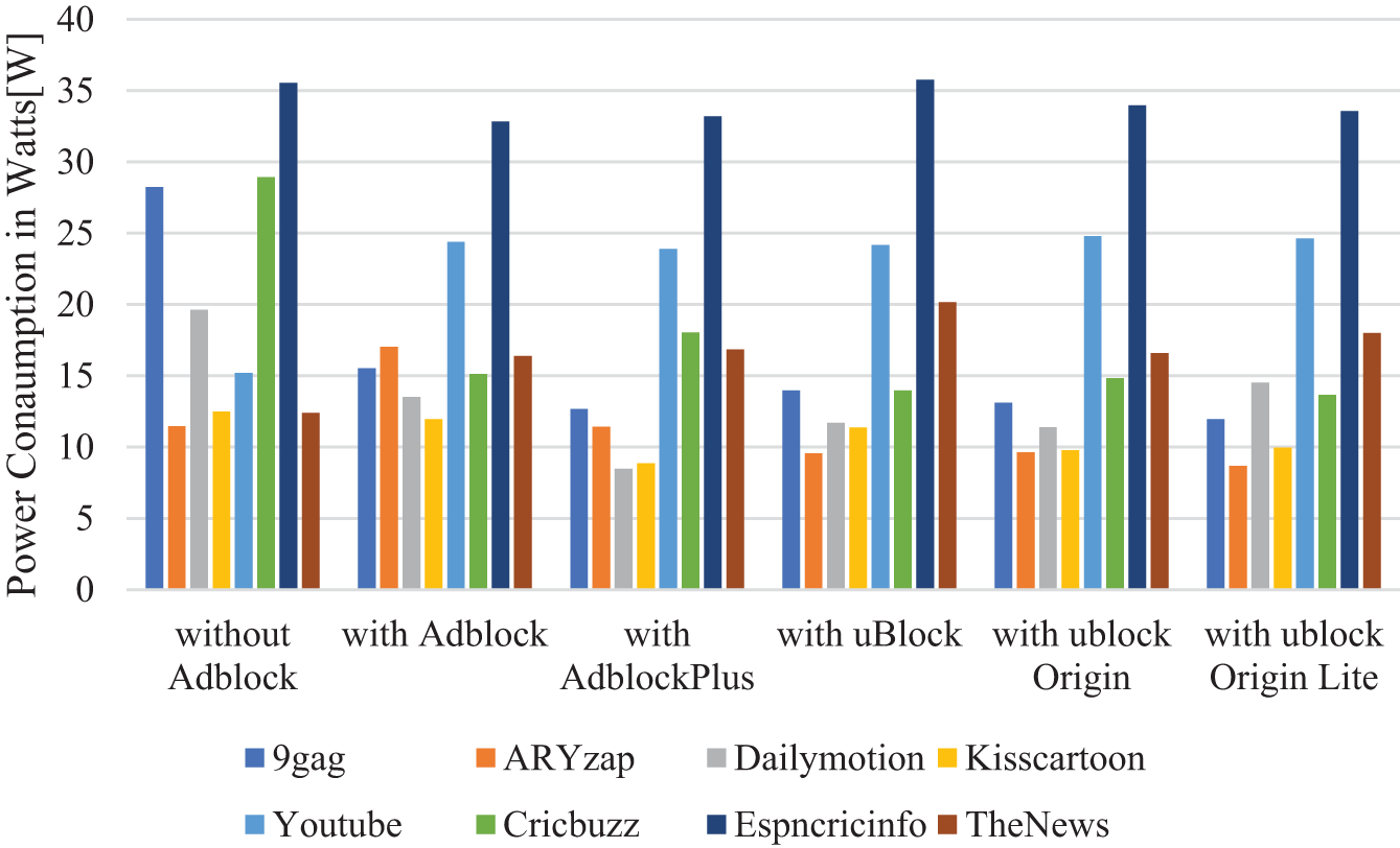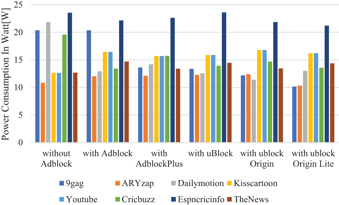 Fig. 5 provides a visual comparison of the power consumption data across all ad-blockers and websites.
