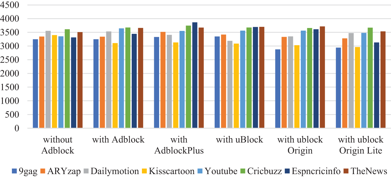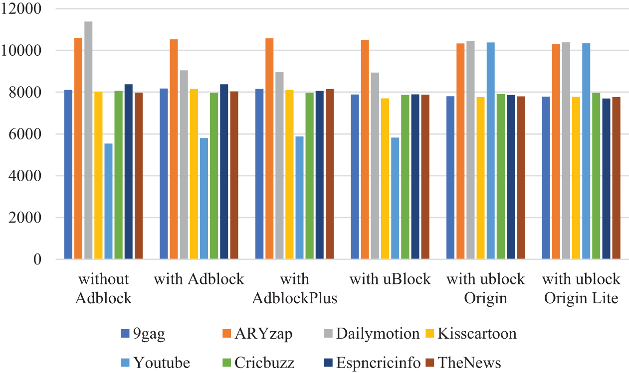 Bar chart has been used to visually compare memory usage for each ad-blocker across different websites (Fig. 6).